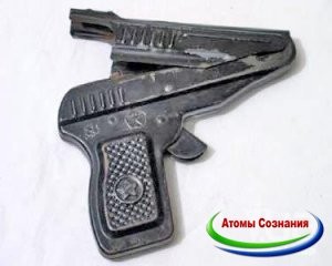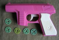 Думаю, многие помнят этот пистолет. И помнят, как мы им играли. Нет, это не привычные войнушки, мало кто пользовался данным пистолетом по назначению. Из этих пулек мы делали кольца (вырезали все внутри, чтобы осталось кольцо), после чего брали любую ось, хоть от пирамиды, хоть от чего, и стреляли. Целью было надеть кольцо на ось пирамиды. У каждого человека или команды были свои цвета пулек, чтобы можно было различить, кто победил.