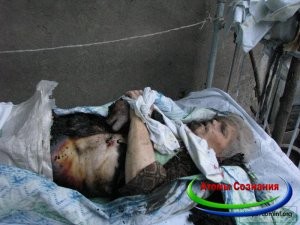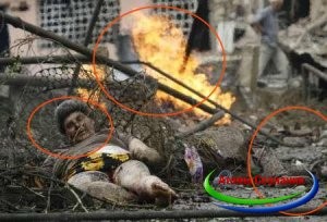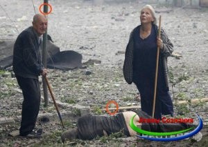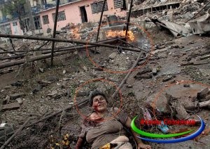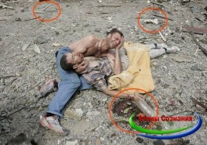 Желтая полоса – должна была относиться к продолжению данного сюжета, и она показывала местонахождение тела относительно лавочки. Но фото найти не удалось. Все форумы, на которых я обсуждал данные фейки – биты. Большую часть фотографий, например, где горит спутниковая антенна (тоже признаюсь по огромному секрету – железо не горит… если его не облить бензином), так же нет некоторых интересных частей к фотографиям с умирающей женщиной с пожаром на заднем плане, которая будет опубликована ниже. Поэтому, пришлось работать именно с фото, которое осталось в сети.