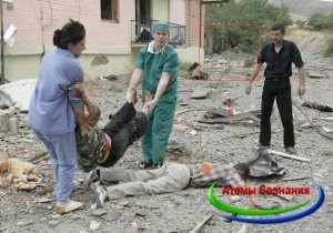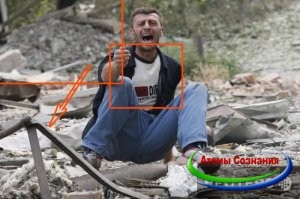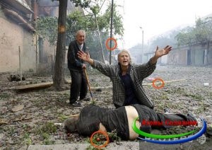 Мне интересно, как репортер узнал о самолете, и оказался в нужной точке, с отличным ракурсом, где видно большую часть города? Обратите внимание, журналист не наблюдает за падением бомбы, а наводит фокус сразу в место падения. Кстати, если вы поищите фото «погибших» грузин, то увидите в данном видео «оживших мертвецов». Вы увидите все те же кадры, которые вы видели на фото. И о, чудо, военные и «скорая» даже не помогают будущим «трупам», фотографа вблизи нет. Если не заметили, то все в дыму, что мало что видно, но фотографии у фотографа четкие.